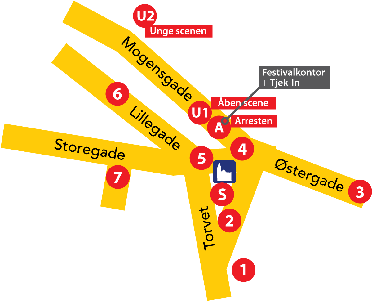 Igen i år opstiller vi 11 scener. 7 podiescener i gågaderne, 3 ungescener i Arresten/Mogensgade samt den store hovedscene på torvet foran kirken.